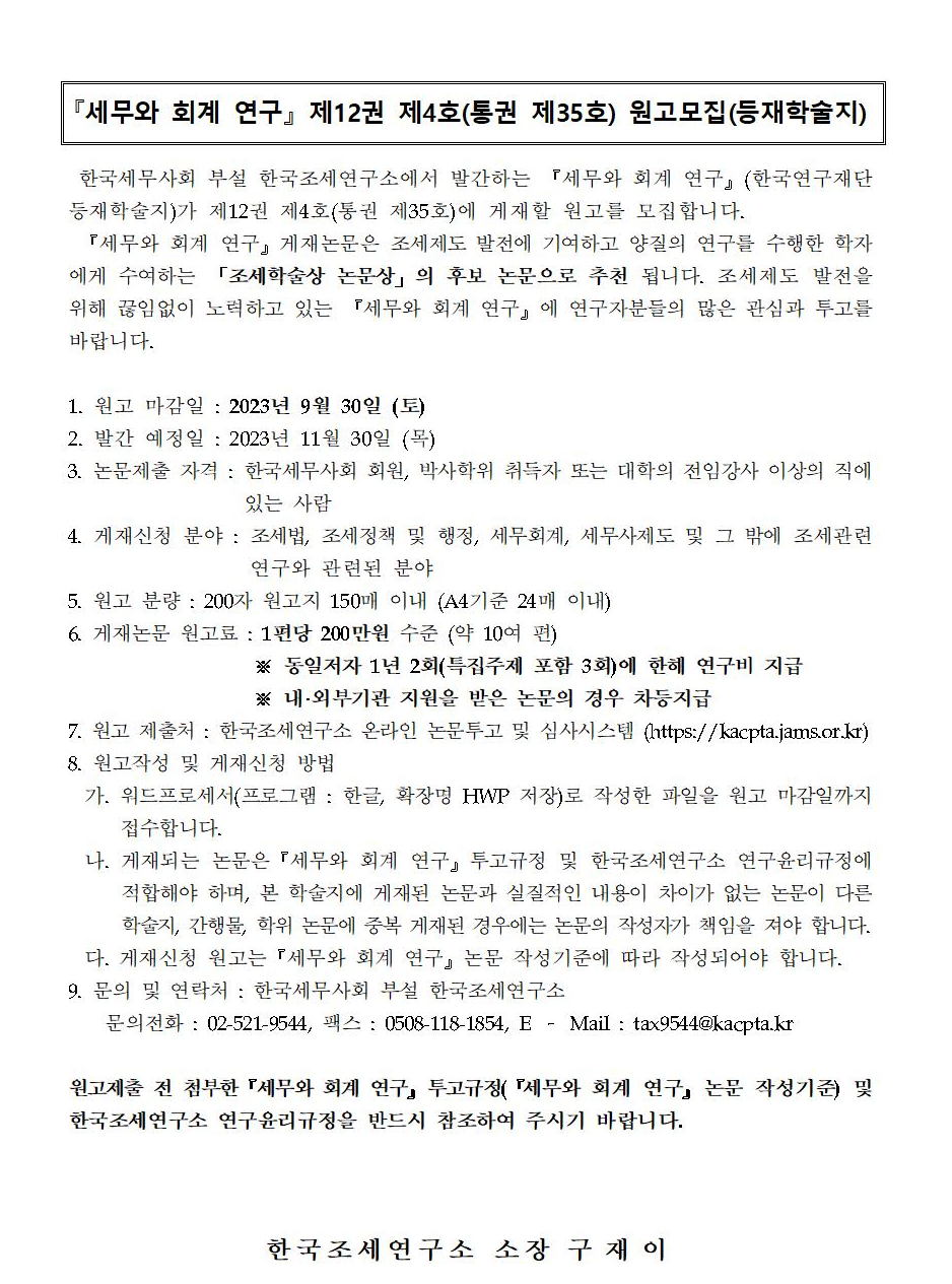 『세무와 회계 연구』 제12권 제4호(통권 제35호) 원고모집(등재학술지)