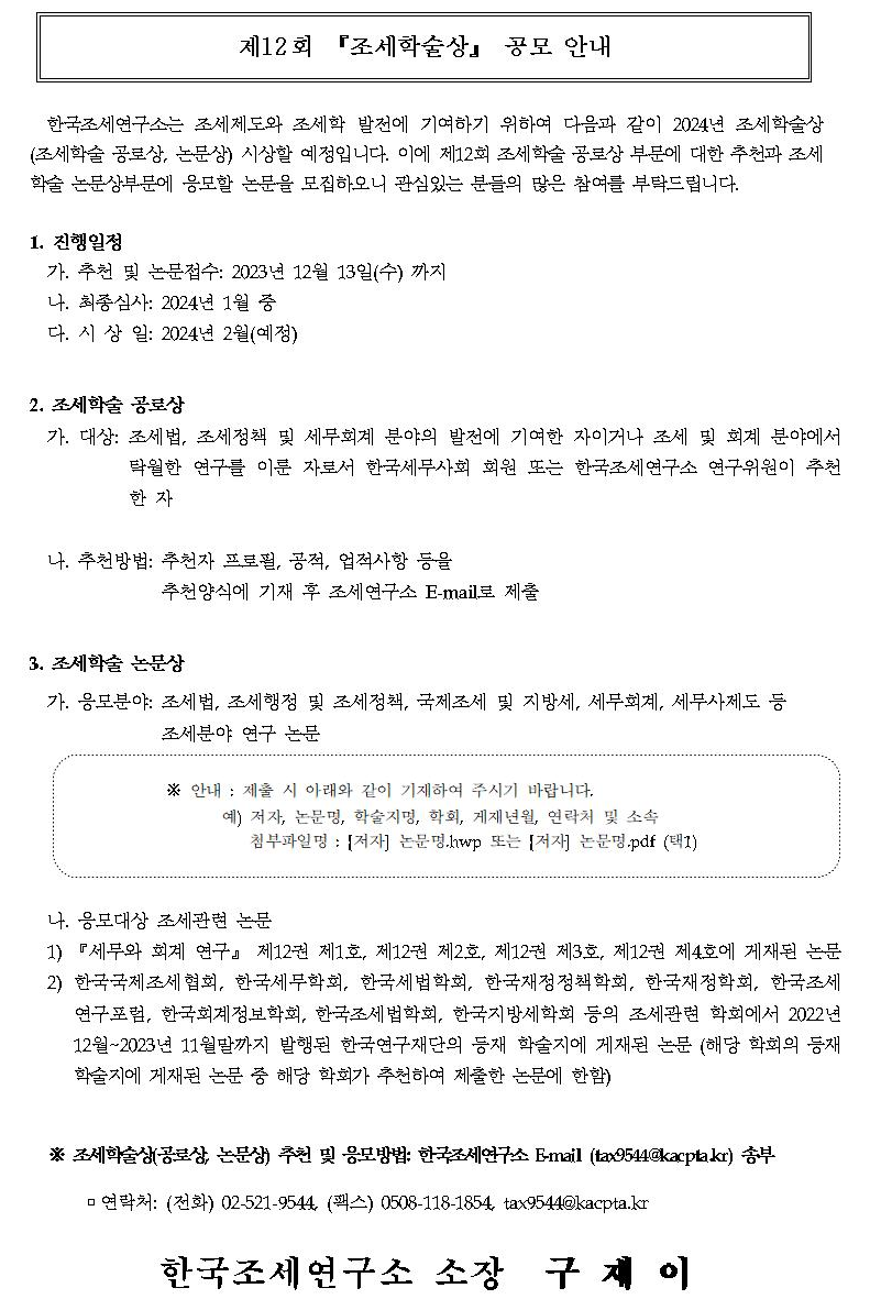 제12회 『조세학술상』 공모 안내