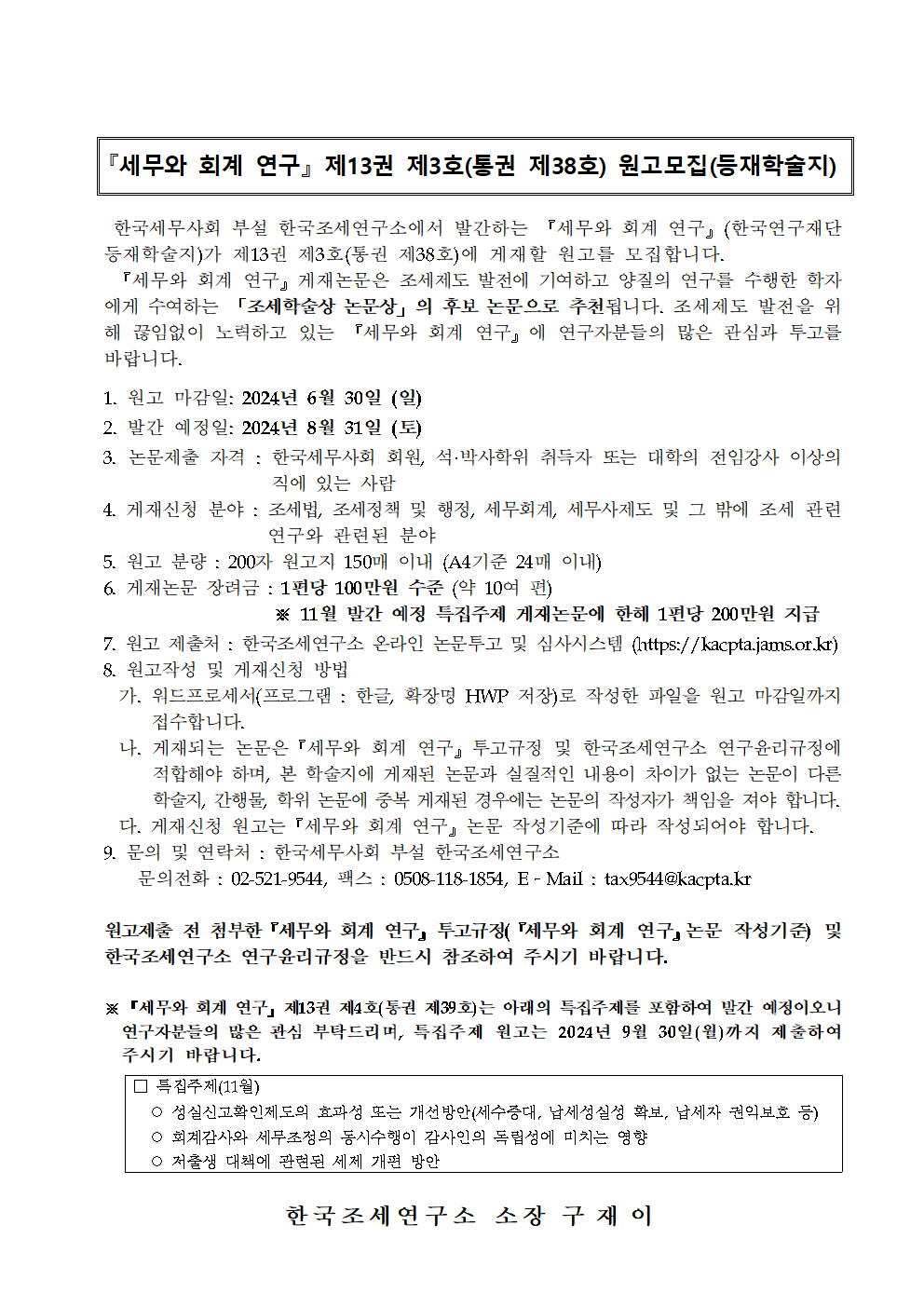 『세무와 회계 연구』 제13권 제3호(통권 제38호) 원고모집(등재학술지)