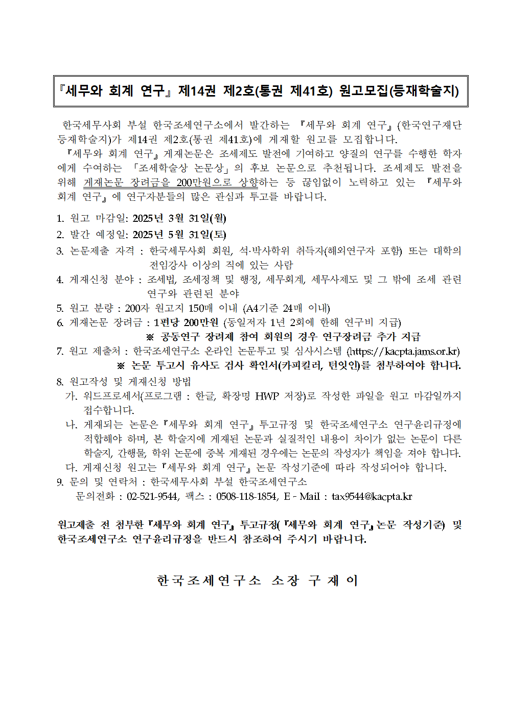 『세무와 회계 연구』 제14권 제2호(통권 제41호) 원고모집(등재학술지)